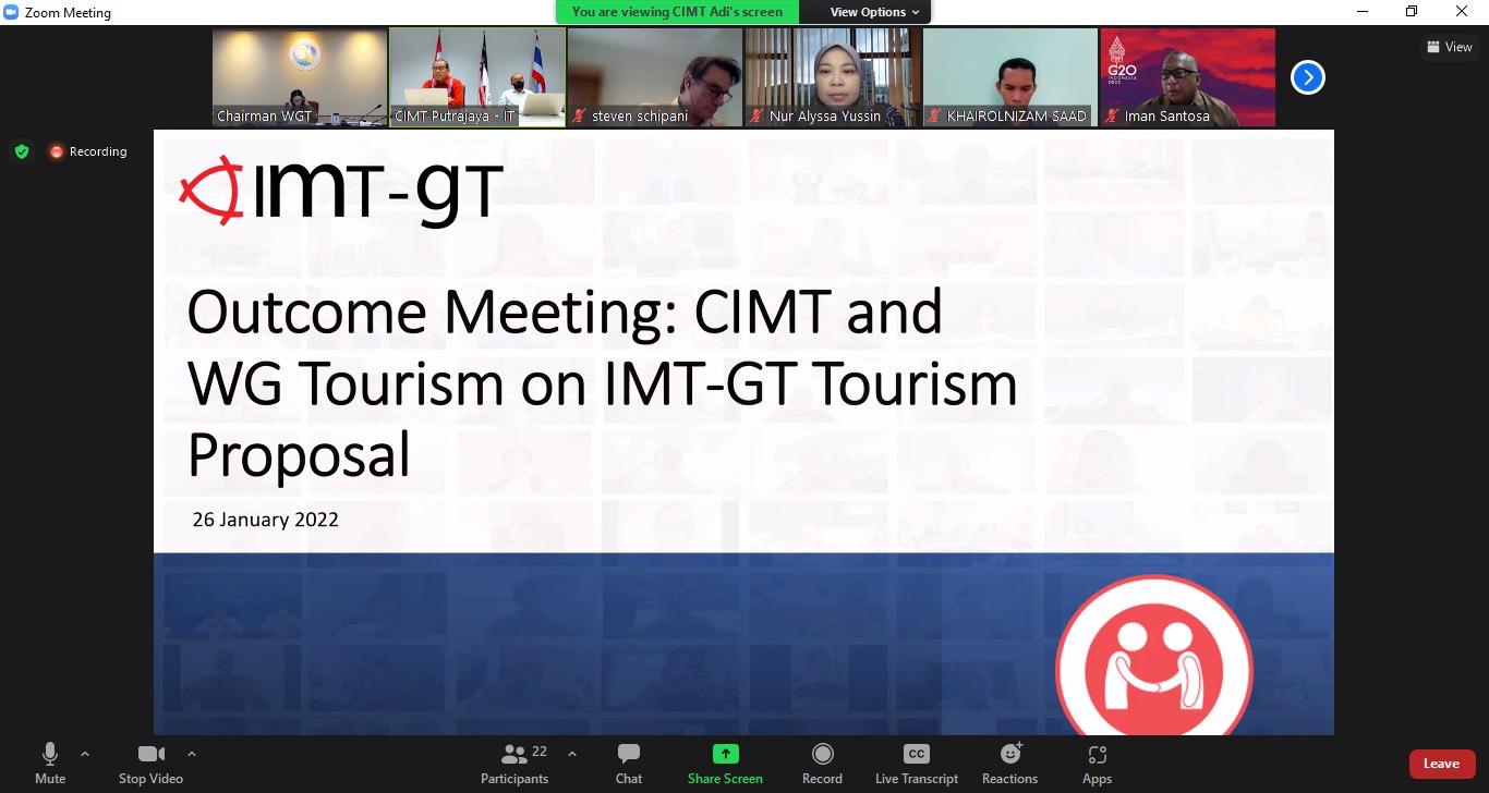 วันที่ ๙ กุมภาพันธ์ ๒๕๖๕ อธิบดีกรมการท่องเที่ยวมอบหมาย นางพัฒนศิริ ศัลยสิริ อิ้วตกส้าน ผู้อำนวยการกองพัฒนามาตรฐานบุคลากรด้านการท่องเที่ยว ปฏิบัติหน้าที่เป็นประธานการประชุมหารือเกี่ยวกับโครงการด้านการฟื้นฟูการท่องเที่ยวของ IMT-GT พ.ศ. ๒๕๖๕ ผ่านสื่ออิเล็กทรอนิกส์ โดยมีผู้เข้าร่วมการประชุมฯ ประกอบด้วย ประเทศสมาชิกแผนงานการพัฒนาเขตเศรษฐกิจสามฝ่าย สาธารณรัฐอินโดนีเซีย - ประเทศมาเลเซีย - ประเทศไทย (Indonesia – Malaysia – Thailand Growth Triangle: IMT-GT) ธนาคารพัฒนาเอเชีย (Asian Development Bank : ADB) และศูนย์ประสานงานความร่วมมืออนุภูมิภาคแผนงานการพัฒนาเขตเศรษฐกิจสามฝ่าย สาธารณรัฐอินโดนีเซีย - ประเทศมาเลเซีย - ประเทศไทย (Centre for IMT-GT Subregional Cooperation: CIMT) ระหว่างการประชุมดังกล่าว ที่ประชุมฯ ได้ร่วมกันหารือและแสดงความเห็นต่อแนวทางการดำเนินโครงการที่คณะทำงานสาขาการท่องเที่ยวนำเสนอ โดยมีมติเห็นชอบให้ดำเนินโครงการในปี ๒๕๖๕ จำนวน ๒ โครงการ ได้แก่